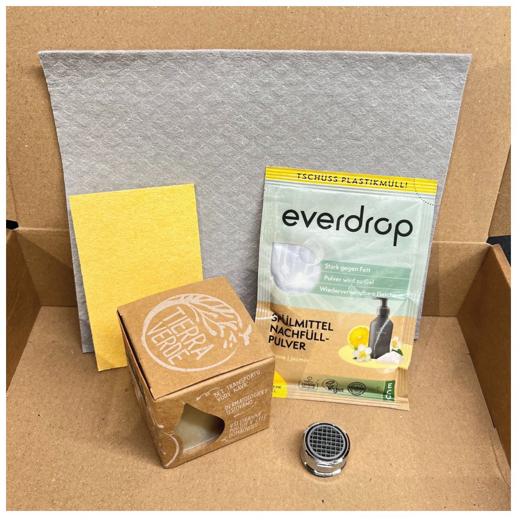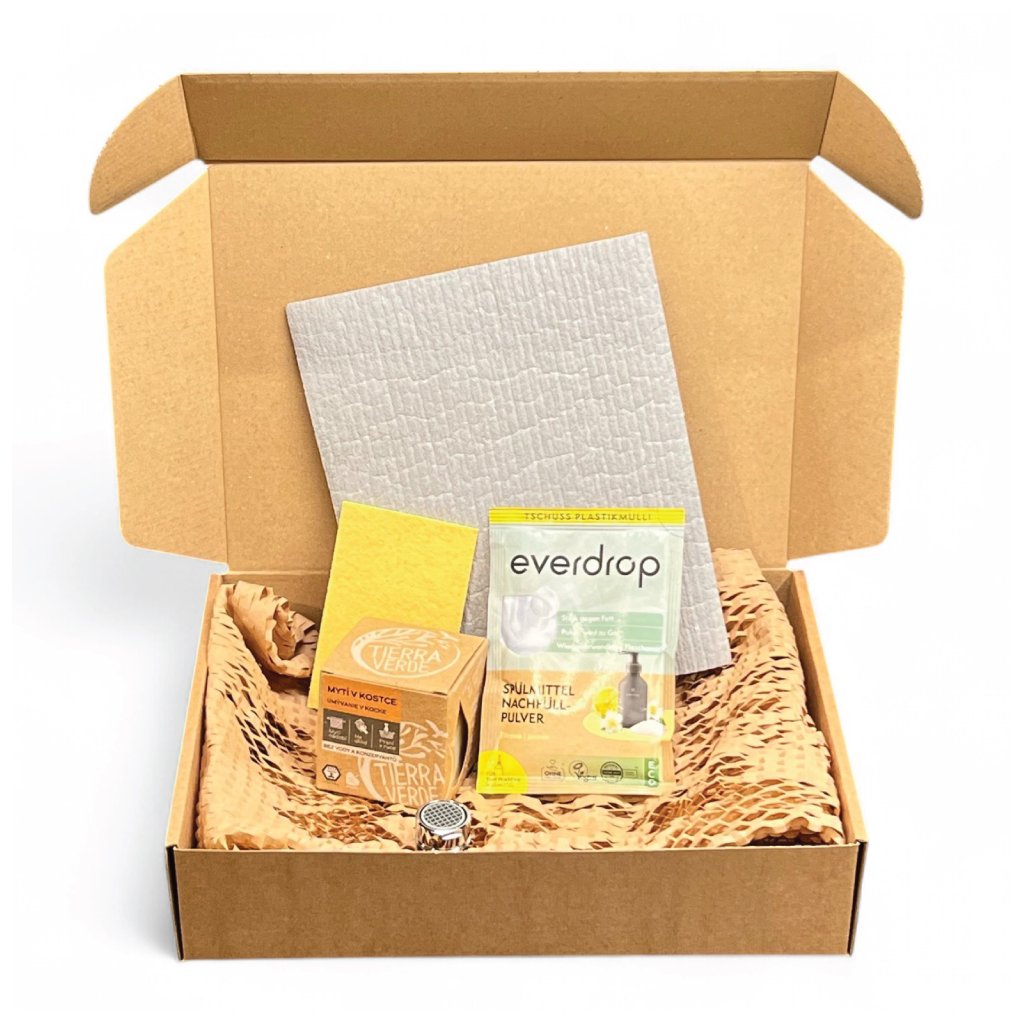 Balík Umyvanie riadov KOMPLET obsahuje všetko, čo potrebuješ, aby si sa zbavil plastov v kuchyni – od čistiacich prostriedkov až po šetrné hubky a perlátor na úsporu vody.