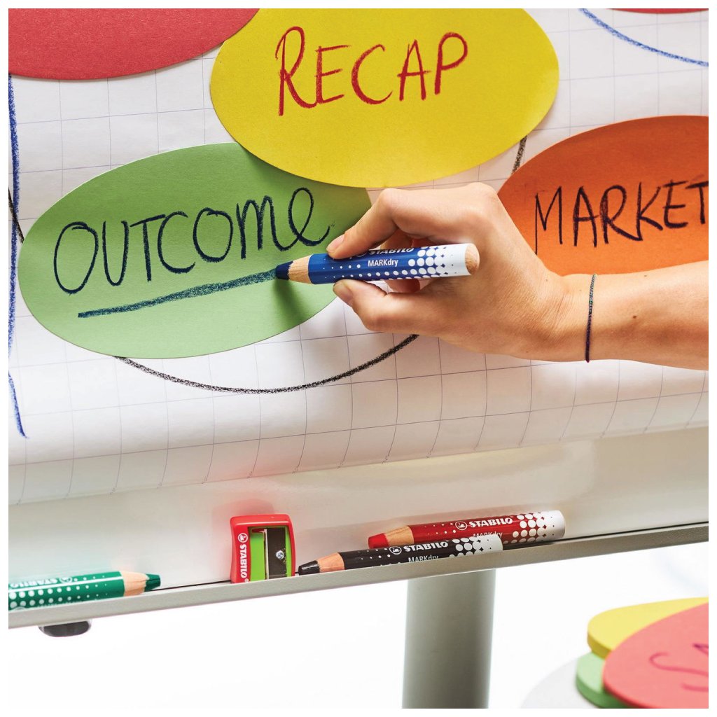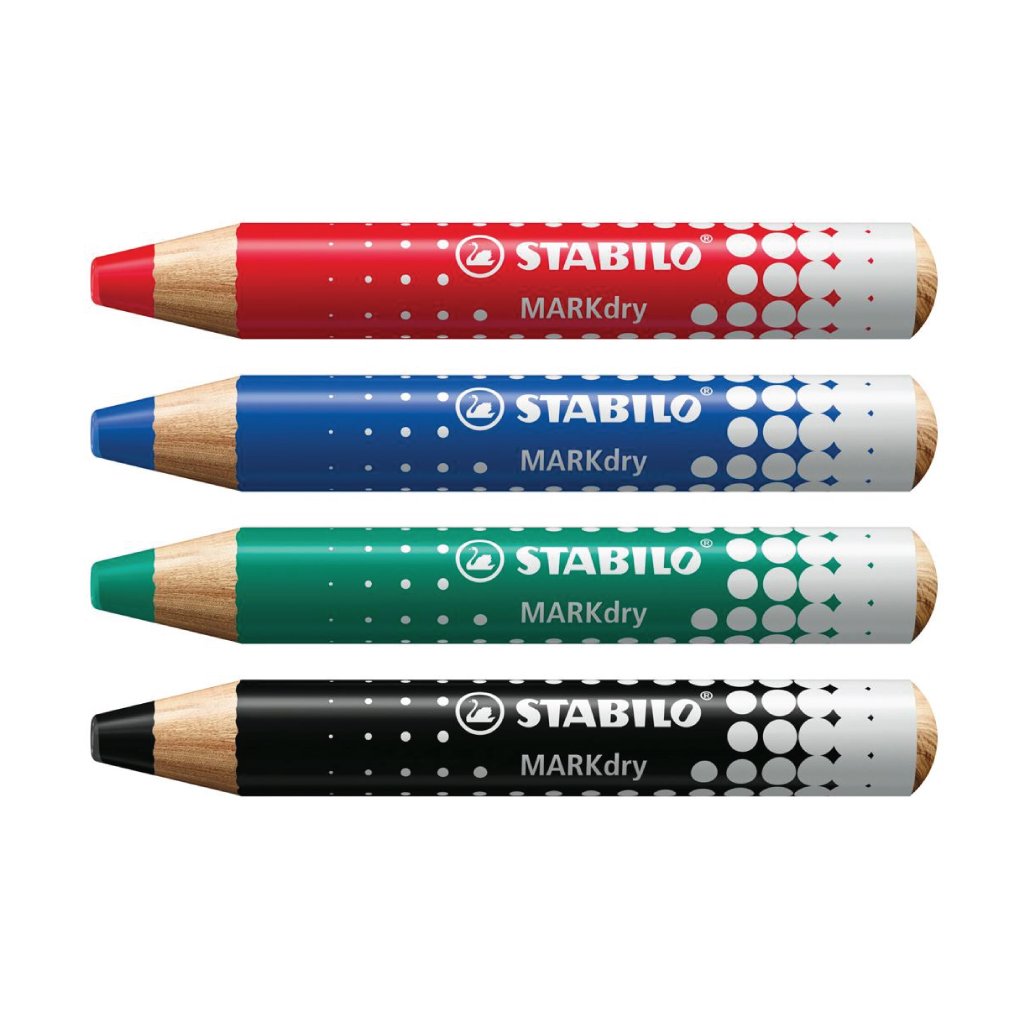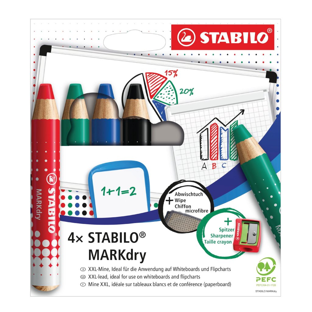 Súprava 4 suchých popisovačov STABILO MARKdry s handričkou a strúhadlom – ideálne na biele tabule, flipcharty aj papier, s intenzívnymi farbami, ktoré sa ľahko zotierajú.