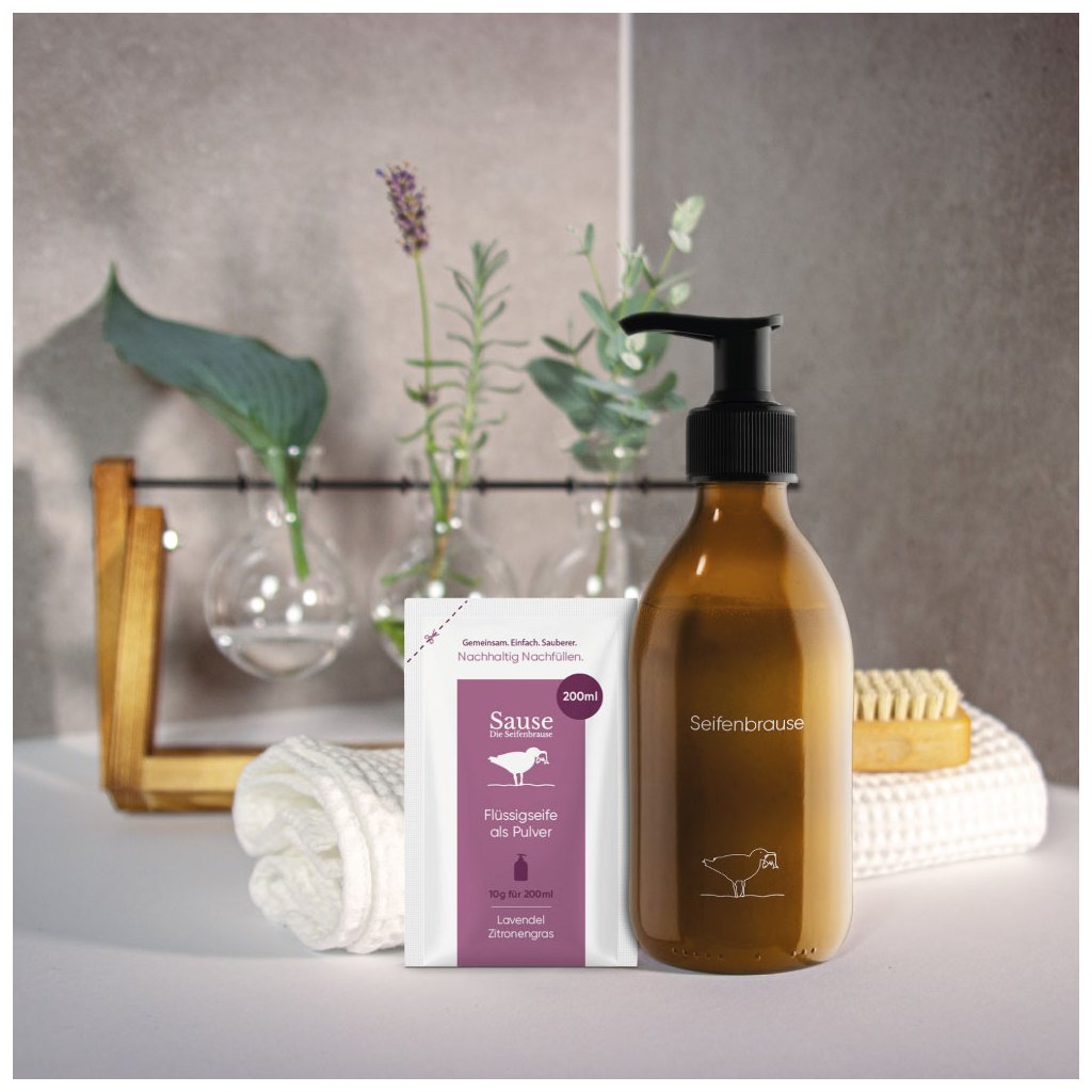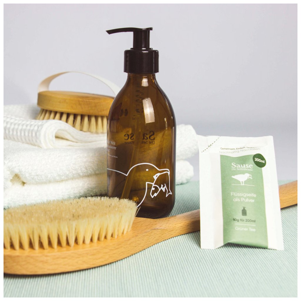 1. Vysypte vrecúško do vlastnej alebo nami ponúkaného dávkovača mydla zo skla / z recyklovaného plastu.